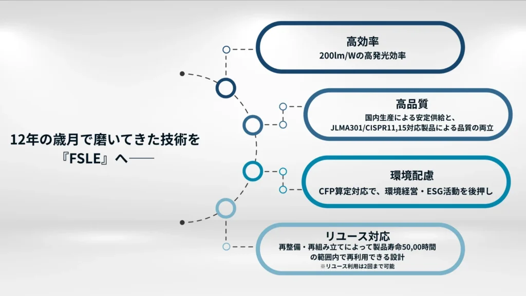 FSLEは、単なるLED照明ではなく、「高品質」と「環境対応型の経営資産」の両方の側面において機能します。